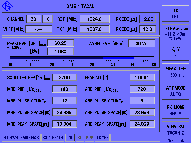 透過選配的 R&S EDST-K1 TACAN 分析功能,儀器能夠精確量測並顯示主參考脈衝串 (MRB) (通常為 12 個雙脈衝) 和輔助參考脈衝串 (ARB) (通常為 6 個雙脈衝) 的脈衝計數與脈衝間隔 。