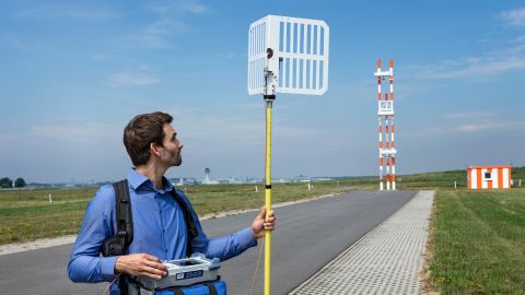 進行現場量測時,應將 R&S EDS300 放置在與地面站之間具有清晰視線 (Line of Sight) 的已知距離位置,為了最大限度地減少地面、建築物等造成的多路徑 (Multipath) 干擾,強烈建議使用具有高指向性、低旁瓣和高前後比的專用測試天線,例如:R&S EDST-Z1 角反射器測試天線。
