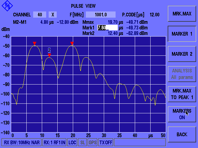 透過 R&S EDS-K2 脈衝分析選項,R&S EDS300 不僅能驗證接收到的脈衝波形是否符合標準,更重要的是,它提供了一個強大的工具來分析多路徑傳播效應;在脈衝視圖中,除了直射的主脈衝外,由山脈、建築物或地表反射而來的延遲訊號分量也會被清晰地捕獲。利用儀器的標記功能,可以精確量化這些反射訊號相對於主訊號的延遲時間與相對幅度衰減,這對於分析特定區域 DME 訊號不穩定的原因至關重要。