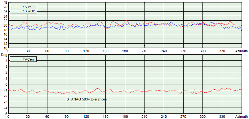 在一個已知與 TACAN 地面站相對方位角的位置上,R&S EDS300 (需配備 R&S EDS-K1 選項) 能夠精確量測並顯示 TACAN 系統的方位角讀數,憑藉其極高的量測精度 (在輸入電平