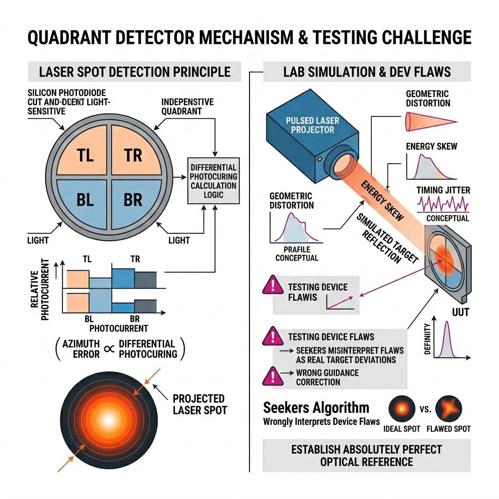 測試規範之所以如此嚴格,根源於「象限探測器(Quadrant Detector)」的物理運作機制,現代雷射尋標器通常採用一個被切割成四個獨立感光區域的圓形矽基光電二極體,當目標反射的雷射光斑擊中這個探測器時,系統會計算這四個區域接收到的光電流差異,以此推算出目標相對於飛彈飛行軸線的幾何方位角誤差。在實驗室中,工程師必須利用一台「脈衝雷射目標投影器」來模擬這個遠在數公里外的反射光斑,如果這台測試設備投射出的雷射光束本身存在幾何變形、能量傾斜或是時序抖動,這些來自「設備自身的瑕疵」將會被待測物(UUT)的尋標器演算法視為真實的空間偏差,導致導引系統做出錯誤的姿態修正,建立一個絕對完美、無瑕疵的雷射光學基準,是所有光電實驗室無可迴避的挑戰。
