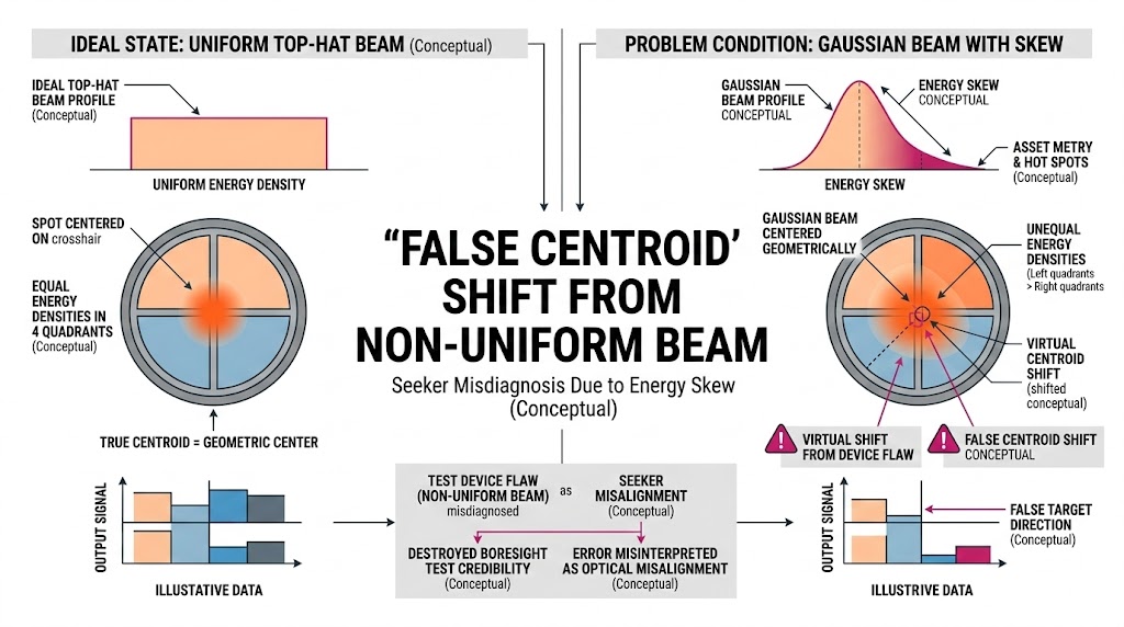 實務上的物理災難在於,原生雷射二極體發出的光束,其能量分佈通常呈現中央極強、邊緣遞減的「高斯分佈(Gaussian Profile)」,甚至可能因為諧振腔的模態不穩定而帶有不對稱的熱斑(Hot Spots),如果測試設備沒有將這種高斯光束轉換為完美的「平頂光束(Top-hat Profile)」,當這道帶有能量傾斜的雷射打在象限探測器上時,致命的誤差就會發生,我們可以用純物理的幾何邏輯來理解:即使這道雷射光束的幾何中心已經完美對準了探測器的物理十字中心,但因為光束左側的能量密度高於右側,探測器左半邊兩個象限產生的光電流將大於右半邊,尋標器的類比數位轉換電路會計算這個電流差,並得出「目標偏向左側」的結論,這種由測試光源空間不均勻性所引起的「虛假質心偏移」,會讓工程師誤判尋標器的光學鏡頭存在嚴重的裝配偏差,直接摧毀了視軸對準測試的公信力。