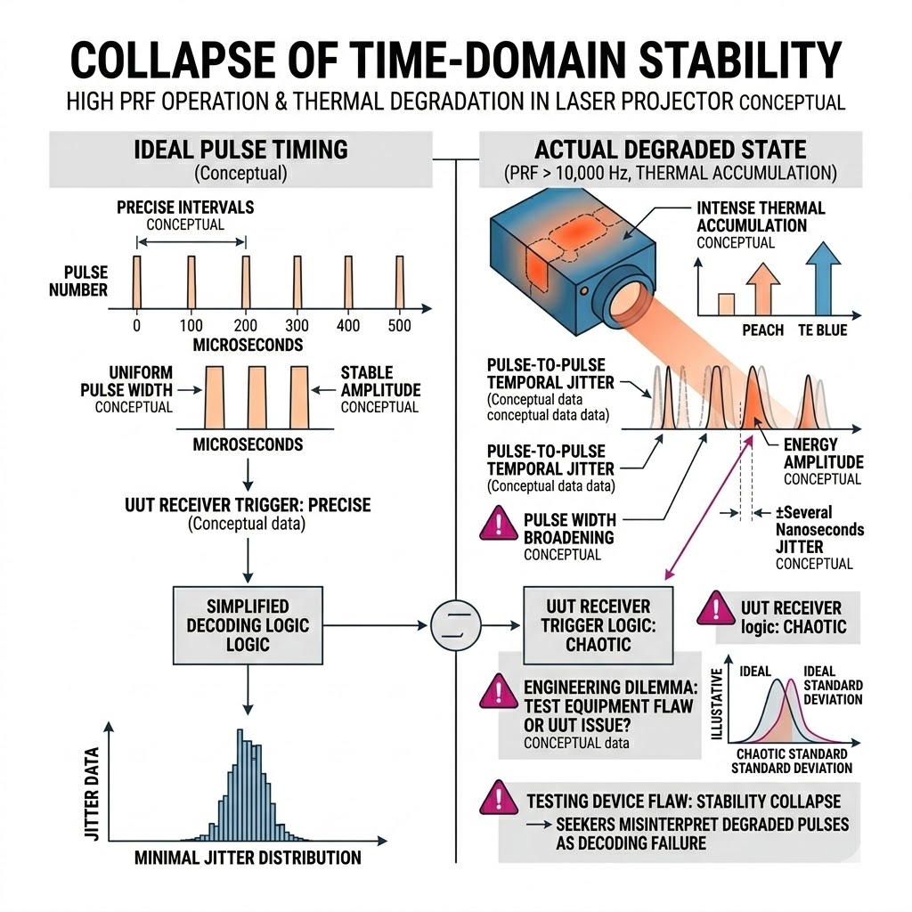 在實驗室測試這種解碼邏輯時,雷射目標投影器必須以極高的脈衝重複頻率(PRF,例如高達一萬赫茲以上)連續發射寬度僅有幾十奈秒的短脈衝,實務上的痛點在於,當雷射二極體在極高頻率下被反覆驅動時,半導體接面會產生急劇的熱累積,如果投影器內部的驅動電路與散熱設計不夠強大,會產生嚴重的「脈衝間時域抖動(Pulse-to-Pulse Temporal Jitter)」以及「脈衝寬度展寬」,使原本設定應該精準在特定微秒間隔發射的脈衝,可能會提早或延遲幾個奈秒出現;同時,單一脈衝的能量振幅也會忽高忽低,當這種帶有時域雜訊與能量變異的訊號進入待測物的接收器時,接收器的閾值電壓觸發邏輯將陷入混亂,工程師將無法釐清,解碼失敗究竟是因為待測物的數位訊號處理器(DSP)運算能力不足,還是因為測試設備發出的雷射脈衝本身就不符合嚴格的時序軍規標準。