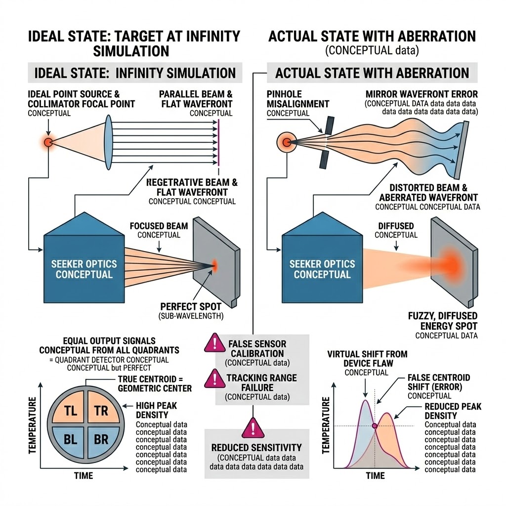 雷射尋標器在真實戰場上觀測的是數公里外的目標,這在光學上等同於一個位於「無窮遠」的點光源,為了在有限空間的實驗室中模擬這個條件,工程師必須將雷射源放置於一組大型準直儀的絕對焦點上。