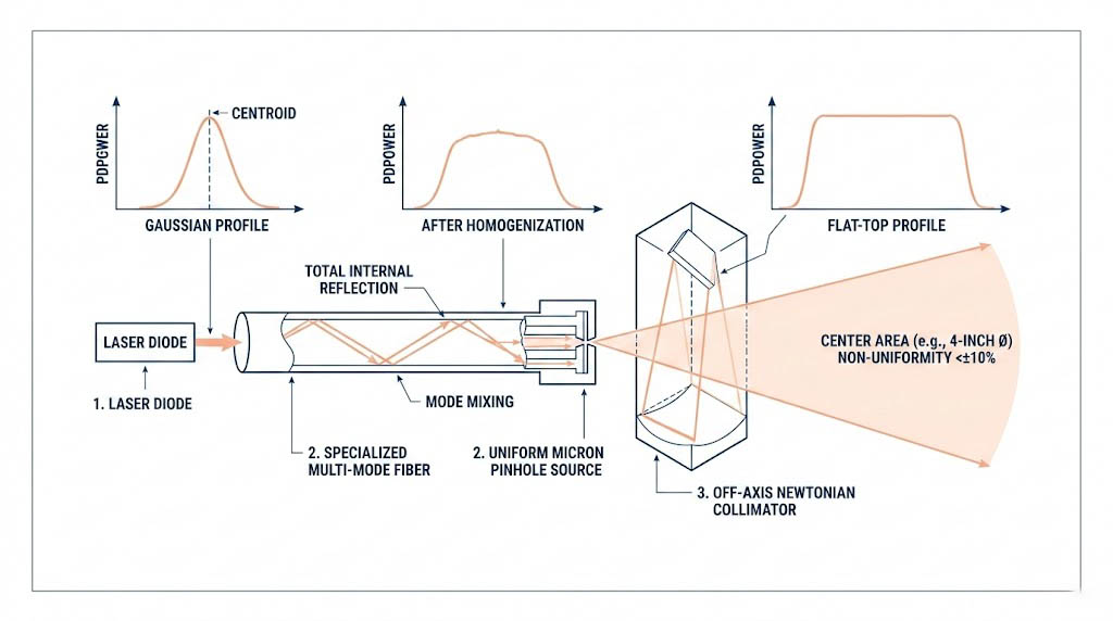 為了解決高斯光束造成的象限探測器質心偏移,系統必須配置「物理幾何勻化與全反射準直架構」,配置邏輯要求,雷射二極體發出的光線必須先耦合進入一段經過特殊設計的單模或多模光纖中,光子在光纖內部經歷無數次的全反射與模式混合後,會在光纖末端的精密微米針孔處,輸出一個極度均勻的次級發光點,接著這個針孔必須被剛性鎖定於一組「離軸牛頓式(Off-axis Newtonian)」反射準直儀的絕對焦點上,由於採用全反射設計,光束在擴束過程中完全沒有中心遮蔽,確保了投射出的大口徑平行光束在中心區域(如直徑四英吋的範圍內),其輻射照度不均勻性嚴格控制在正負百分之十以內,這種近乎完美的「平頂」平行光,是象限探測器對齊測試中不可或缺的絕對物理基準。