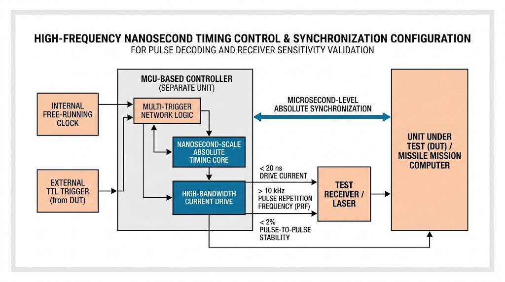 針對脈衝解碼與接收器靈敏度驗證,系統的電子驅動核心必須走向「奈秒級絕對控制」,配置的核心在於分離式的高階微處理器控制器,該控制器必須具備極高頻寬的電流開關能力,能夠在超過一萬赫茲(10 kHz)的極端脈衝重複頻率下,穩定輸出寬度僅二十奈秒的驅動電流,且保證脈衝間的能量變異(Pulse-to-Pulse Stability)小於百分之二;此外,系統配置必須具備多重觸發網路,允許內部自由運行,或是接收來自待測物的外部 TTL 觸發訊號,這種配置能確保測試設備與飛彈的任務電腦達成微秒級的絕對同步,為複雜的雷射編碼驗證提供堅若磐石的時序基礎。