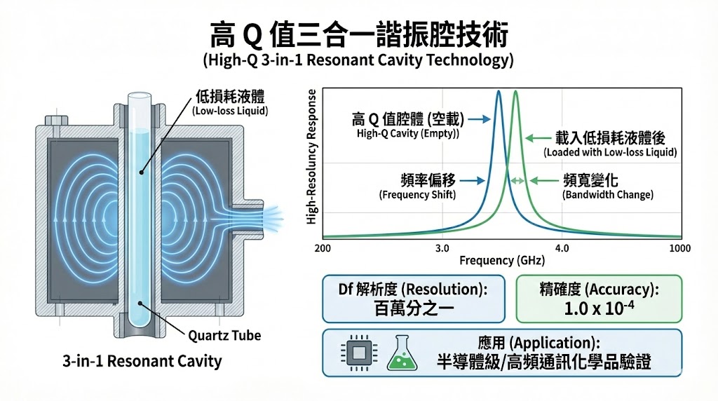三合一諧振腔採用 高 Q 值(品質因子) 的設計原理,當低損耗液體放入腔體後,即便液體吸收的能量極少,高 Q 值腔體也能敏銳地偵測到共振峰的頻率偏移與頻寬變化。此類諧振腔技術對損耗角正切(Loss Tangent, Df)的解析度可下探至 百萬分之一 (Millionths place) 等級,精確度數量級達到 1.0 x 10^-4,這使其成為驗證半導體級化學品或高頻通訊用特用化學品的利器。