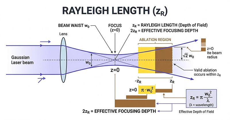 在雷射物理學中,光束並非完美的平行直線,而是呈現高斯分佈(Gaussian Profile)並遵循繞射定律,當雷射光束經過聚焦透鏡後,會在焦點處形成一個最窄的「束腰(Beam Waist)」,而在焦點上下兩側,光束會以一定的角度發散,焦點附近能量密度足以進行材料剝離的有效長度,被稱為「瑞利長度(Rayleigh Length)」或景深。
