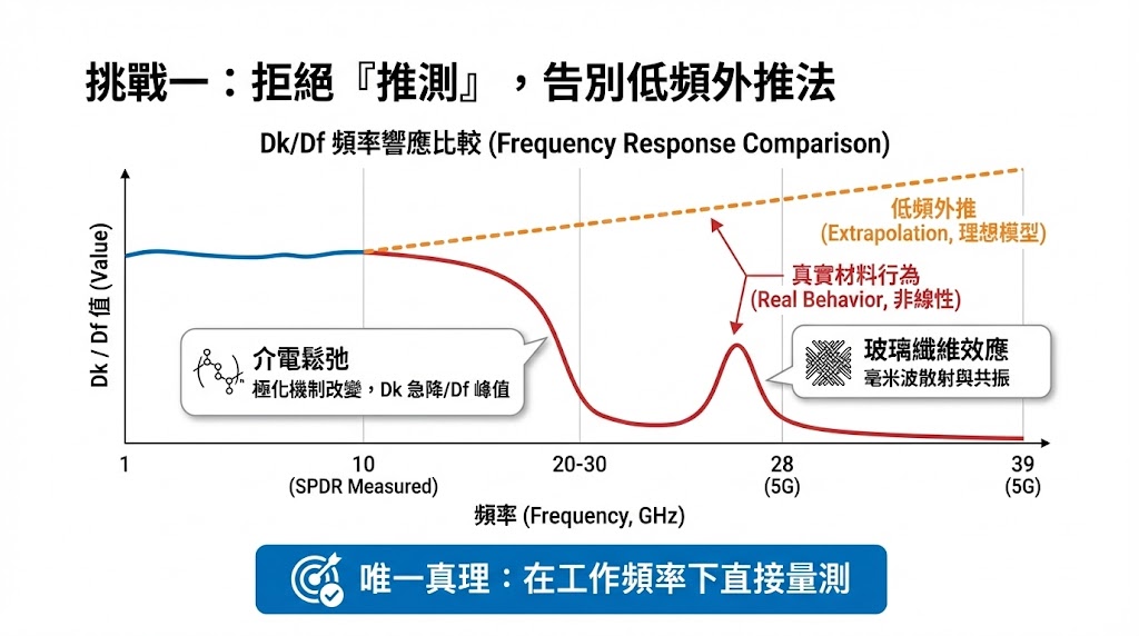 在 4G 時代,許多材料商提供的 Dk/Df 數據僅測量至 1 GHz 或 10 GHz(通常使用 SPDR 方法),當工程師需要 28 GHz 的數據時,常見的做法是利用 Djordjevic-SarkarDebye 模型進行數學外推,然而真實世界的材料並非理想模型。