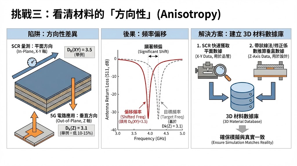 對於含有玻璃纖維的複合材料,平面 Dk 通常比垂直 Dk 高出 10% ~ 15%,如果工程師直接將 SCR 測得的 28 GHz 平面數據(例如 Dk=3.5)套用到天線模擬(實際 Z 軸 Dk=3.1),天線的中心頻率將會發生顯著偏移。