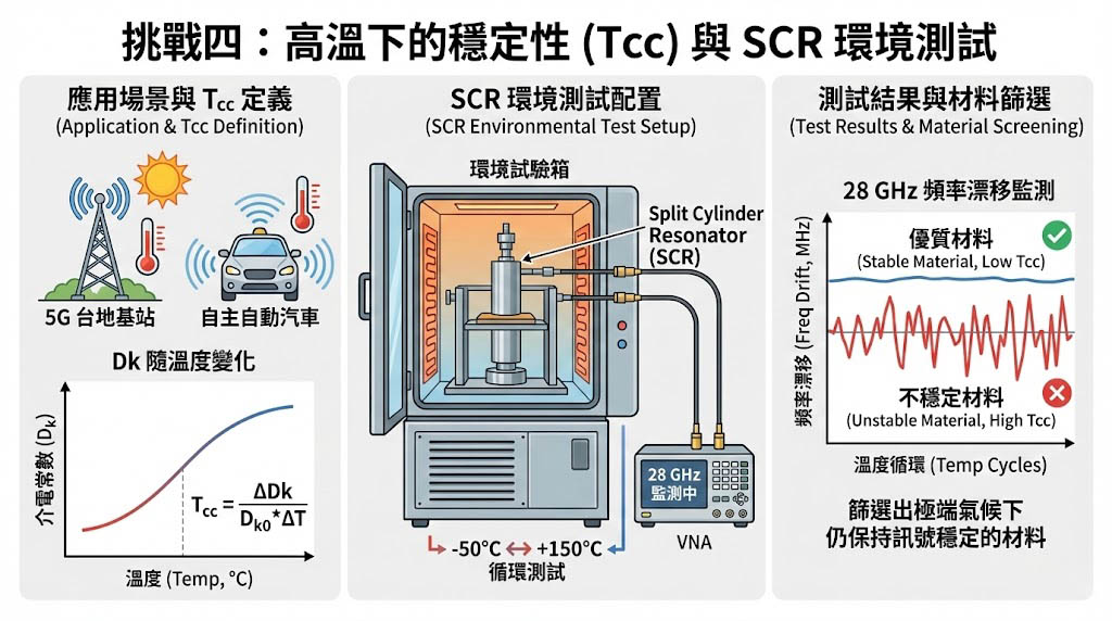 5G 基地台與車用雷達常在戶外高溫環境下運作。材料的 Dk 值隨溫度變化的程度,由 介電常數溫度係數 (Tcc) 定義,SCR 的開放式金屬結構非常適合搭配環境試驗箱,透過自動化系統,可在 -50°C 至 +150°C 的循環中,連續監測 28 GHz 下的頻率漂移。這能協助工程師篩選出在極端氣候下仍能保持訊號穩定的優質材料。