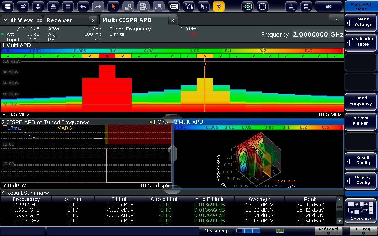 高階 EMI 接收機的 Multi-CISPR APD 顯示介面,同時展示 2D 統計曲線與 3D 頻譜概率分佈,用於深度分析數位干擾。