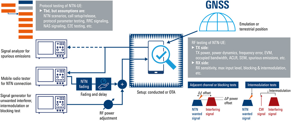 進行充分的 UE 測試需要一個系統模擬器,它能處理包含整個協定堆疊的連接,並允許進行 RF 測試和協定測試;NTN 終端的一個要求是地面位置確定,因此透過 GNSS 訊號的定位是 NTN UE 的一項強制性能力,衛星站透過系統資訊發送自身的軌道數據,並支援 UE 校正時間偏移和多普勒頻移。