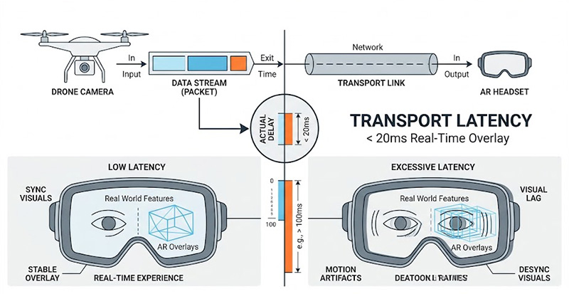 擴增實境與一般視訊會議最大的不同在於,AR 畫面必須與使用者的頭部運動達到幾何上的絕對同步,根據 3GPP TR 22.804 針對「垂直領域自動化通訊」的軍事應用規範,AR 設備的「應用層來回延遲(Round-trip Latency on Application Layer,包含影像處理與解碼時間)」必須小於 50 毫秒,為了達成這個目標,底層的「傳輸層延遲(Transport Layer Latency)」被嚴格壓縮至小於 20 毫秒,測試工程師的痛點在於,在動態的戰術環境中,網路封包會經歷基站切換(Handover)與無線電資源重新分配,傳統基於 ICMP Ping 的測試完全無法反映真實應用負載下的非對稱延遲,若網路抖動(Jitter)導致某一幀影像延遲超過 20 毫秒,士兵眼前的目標指示框將會發生「空間漂移」,徹底摧毀戰術射擊的精準度。