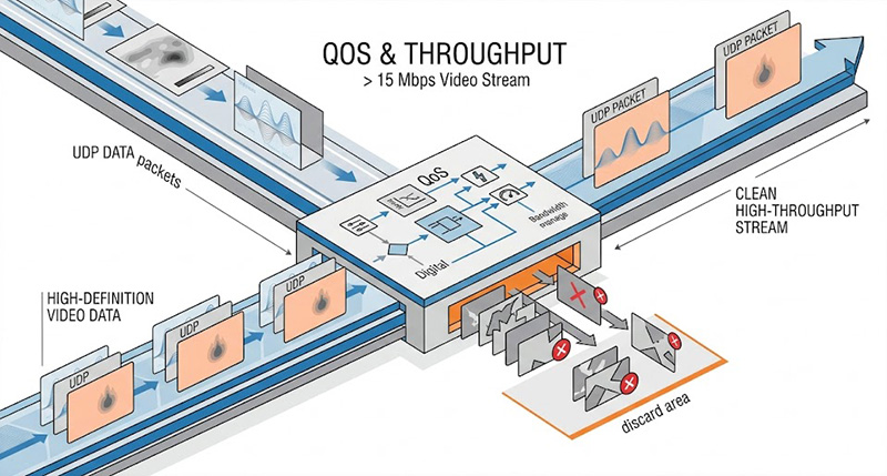 當一架偵察無人機將高動態範圍(16-bit HDR)的 LWIR 夜視畫面下行傳輸至 5G 基地台,再由基地台同步廣播至整個步兵小隊的 AR 眼鏡時,網路同時承載著極重的上行與下行負載,對於軍規 AR 應用,網路的 IP 持續傳輸量(Sustainable Throughput)在上下行鏈路皆必須穩定大於 15 Mbit/s(通常支援 60 fps、Full HD 解析度),由於這類即時影像資料流採用無法重傳的 UDP 協定,因此網路對於訊號衰減的容忍度極低,軍規標準要求其封包遺失率(Packet Loss Ratio, PLR)必須嚴格控制在 0.1% 以下,工程師極難在實驗室內模擬同時有數十名士兵與無人機在高負載狀態下,網路是否會因資源排程衝突而發生無預警的掉包與影像破圖(Macroblocking)。