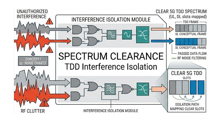 在實際戰區建置機動式 5G 戰術網路時,電磁環境(EME)往往極度惡劣,5G 網路主要採用分時雙工(TDD)技術,高度依賴精確的上下行時槽同步,如果作戰區域內存在未經授權的射頻來源、敵軍的電子戰(EW)寬頻干擾、或是相鄰友軍網路未進行 TDD 同步,將產生嚴重的跨網路干擾,這種干擾會使訊號干擾雜訊比(SINR)急遽惡化,直接削減 5G 網路的覆蓋範圍並導致 AR 資料鏈路中斷,如何在不中斷戰術任務的前提下,以被動方式掃描整個頻段、解碼廣播系統資訊塊(MIB/SIB),並於充滿雜訊的多路徑環境中精準揪出干擾源,是網路優化與部署階段的首要難關。