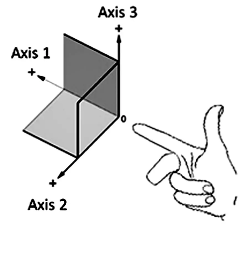 平移運動指的是物體在空間中沿著直線的移動,不涉及自身的旋轉。在標準的笛卡爾座標系中,這通常對應於 X、Y、Z 三個互相垂直的軸向;圖中所示,其標示的 Axis 1, Axis 2, Axis 3 即為此類三維正交座標系統的基本示意。