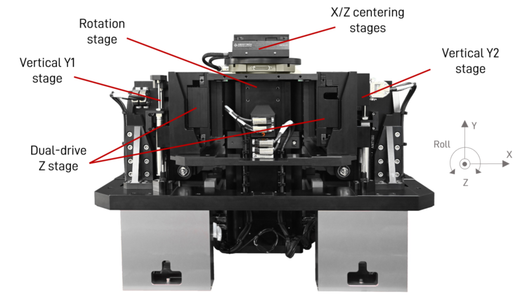 為了將樣品精確地對中並對準旋轉軸,旋轉平台上方通常會設置額外的平台,此類對準通常涉及 X、Z 軸的運動,有時也包含傾斜/擺動(tip/tilt)的調整,一旦樣品成功對準旋轉軸,這些平台在整個成像過程中便會保持靜止,以確保影像的穩定性與準確性。