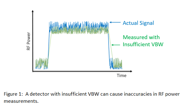 如圖 1 所示,調變訊號呈現快速的振幅變化,以藍色表示,這是具有足夠 VBW 能力的感測器所量測到的結果;綠色波形則是 VBW 不足的感測器所產生的,它無法精確地描繪脈衝。