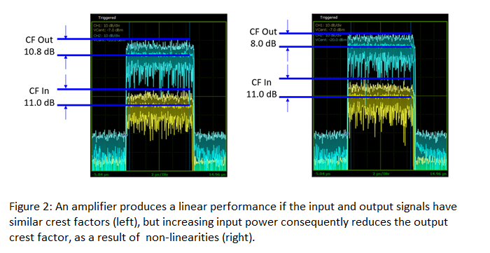 高波峰因數的波形可能會影響 Wi-Fi 通訊系統傳輸路徑上元件(例如放大器)的線性操作;因此,工程師可以透過計算這個重要的指標來發現訊號壓縮並保持波形保真度;為了確定放大器的線性效能,工程師使用峰值功率感測器量測施加的調變波形輸入和輸出訊號的波峰因數;在圖 2 中,左側的計算結果僅相差 0.2 dB,表示線性操作;然而,增加輸入到放大器的功率會導致輸出波峰因數顯著下降,如右側圖所示;波峰因數量測結果的這種差距表明放大器操作中存在非線性,這可能會降低通訊通道的動態範圍並導致頻譜再生。