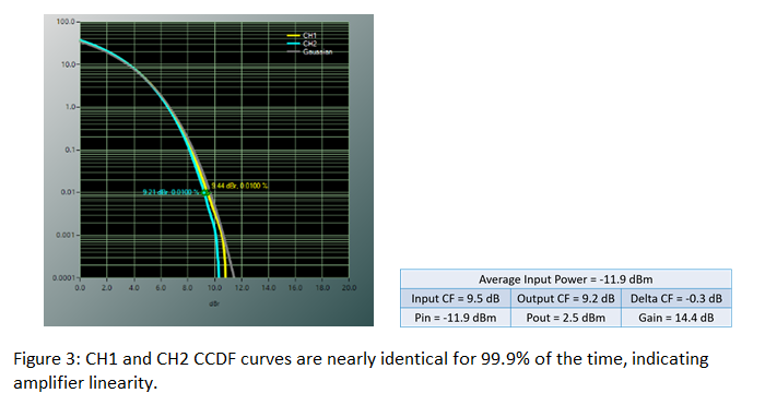 在圖 3 所示的 CCDF 圖中,黃色輸入通道 (CH1) 的調變訊號施加到放大器的平均功率為 -11.9 dBm,並在相應的 CCDF 曲線中與藍色放大器的輸出功率 (CH2) 一起表示;使用者需要設定一個取決於應用程式的感興趣波峰因數發生率;由於 0.01% 是一個常用的比率,圖 3 的曲線標記顯示了輸入和輸出訊號在 0.01% 時間的波峰因數,以及表格中的補充資訊;總體而言,由於輸入和輸出波峰因數曲線幾乎相同,CCDF 圖驗證了線性度。