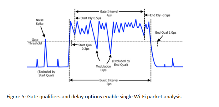 通常,人們更傾向於放大訊號的特定部分,而不是查看整個波形;例如,工程師可能希望專注於或排除 Wi-Fi 訊號的前導部分,並確定閘控訊號的基本量測,如峰值、平均和最小功率;可以使用供應商提供的或客戶自行開發的功率量測軟體中提供的閘控條件和延遲選項來縮小特定脈衝部分的範圍。