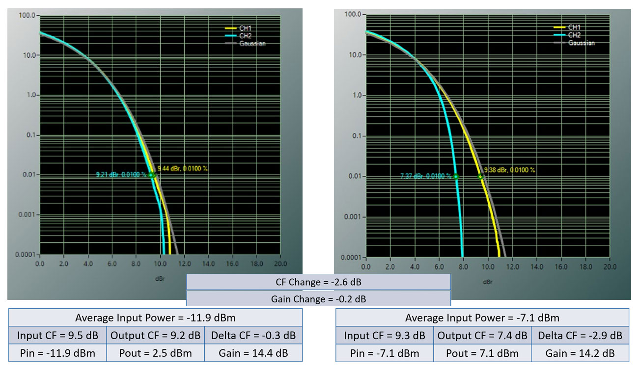 圖二:輸入和輸出訊號之間相似的 波峰因數 數值驗證了 放大器 的 線性度(左圖);而當 波峰因數 出現顯著差異時,則表明 放大器 性能已進入 非線性 狀態(右圖)。
