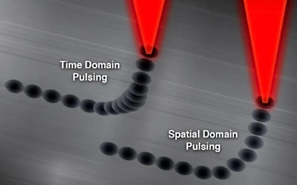 圖 3. 空間域脈衝觸發技術,消除了在加速期間雷射能量的過度累積,並確保雷射脈衝根據實體軸向編碼器的回饋,精確地落在正確位置。