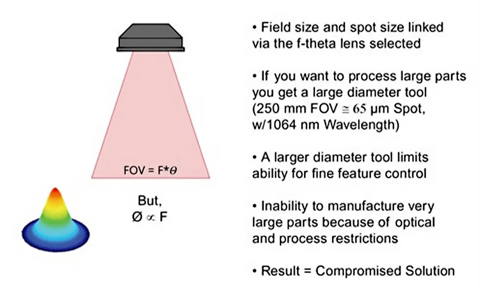 Aerotech 的無限視野 (Infinite Field of View, IFOV) 控制器功能,顯著提升了雷射加工系統的產能品質精度,有了 IFOV,採用雷射掃描器的系統其工作區域將不再受到限制,這允許系統選用最佳化的光學元件,以最小化光點尺寸,同時保持工作區域的靈活性,在多數當代採用振鏡掃描頭的雷射加工系統中,加工範圍大小和聚焦後的光點直徑,是透過 f-theta 透鏡的選擇而相互關聯的。