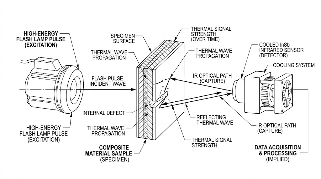 在現代航太工程與高階製造領域,碳纖維強化聚合物 (CFRP) 等複合材料已被廣泛應用,然而這類材料在製造或服役過程中,極易產生肉眼無法察覺的微小脫層 (Delamination)、孔洞或水分侵入,為了在不破壞結構的前提下進行大面積掃描,主動式非破壞性檢測 (Active NDT) 已成為業界標準;其運作物理機制是透過高能閃光燈或超音波對材料表面施加瞬態熱脈衝,並利用高階紅外線攝影機記錄表面熱量向內部傳導的熱衰減曲線 (Thermal decay curve),由於材料內部的缺陷會阻礙熱傳導,進而在表面形成微小的溫差特徵。