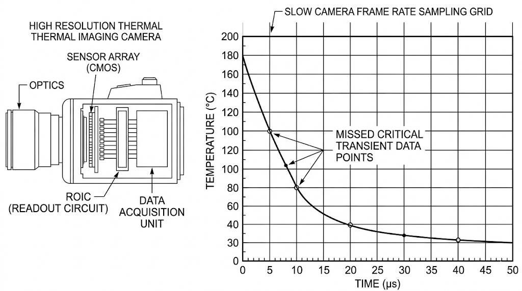 這張示意圖展示了熱顯像技術中的資料取樣問題:左側為熱顯像儀的剖面圖,標示了光學元件(Optics)、CMOS 感測器陣列、讀出電路(ROIC)以及資料擷取單元;右側則是溫度對時間的圖表,該圖表顯示由於熱顯像儀的訊號取樣頻率過低(即「取樣網格」過於稀疏),導致在熱暫態快速下降的陡峭階段,漏失了關鍵的資料點,這說明了當物體溫度快速變動時,必須使用更高取樣率的設備才能準確記錄。