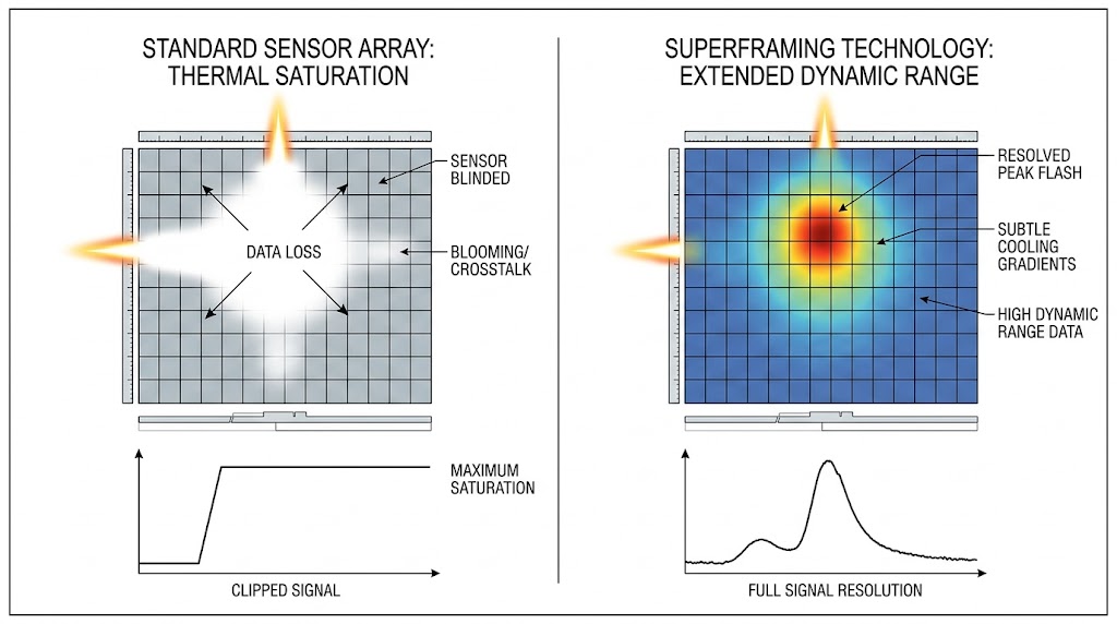 本圖為超幀技術單點聚焦示意圖:它比較了標準感測器(左)因強熱源致盲、光暈導致數據丟失,而「超幀」(右)能擴展動態範圍,精確解析峰值與微妙梯度,實現完整訊號。