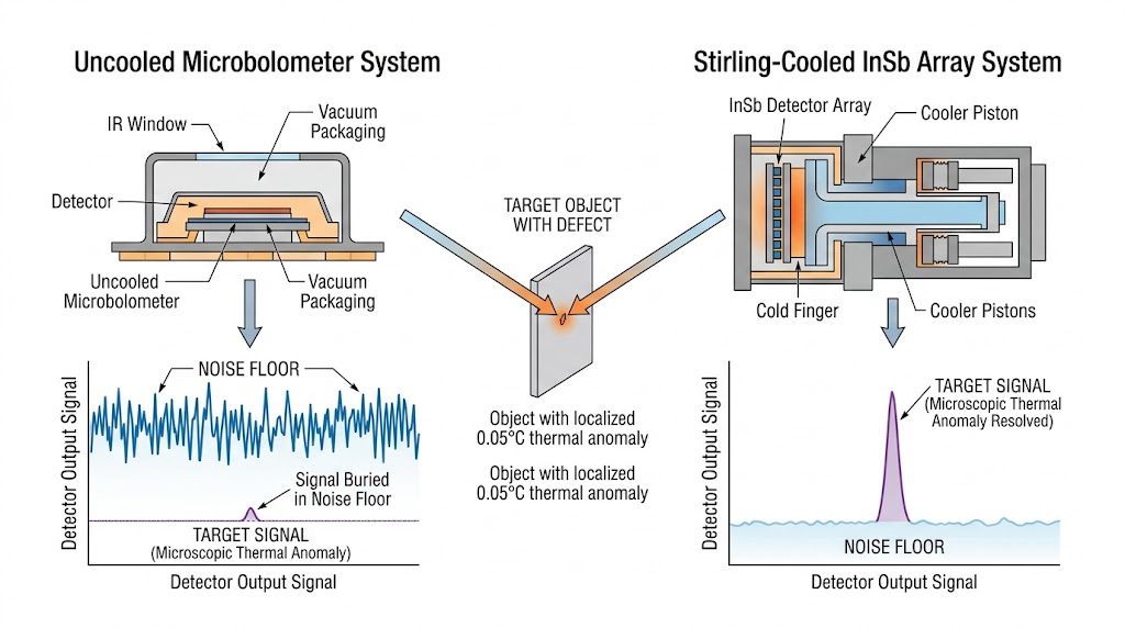 隱藏於複合材料深層的脫層缺陷,傳導至表面的溫差特徵往往小於 50 mK;傳統非冷卻微測輻射熱計的雜訊等效溫差 (NEdT) 通常在 50mK 至 100mK 之間,這意味著深層缺陷的微弱訊號會直接被設備自身的底噪所掩蓋,要取得純淨且可量化的熱擴散數據,依賴未深度製冷的感測材料將無法建立穩定的高訊噪比 (SNR) 測量基準。