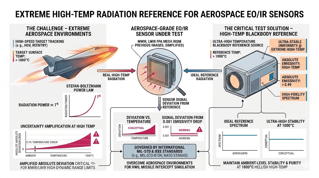 在這樣的技術背景下,國際軍規與工業標準經歷了前所未有的嚴格修訂,例如針對航太光電載荷熱適應性的 MIL-STD-810H 規範、北約 STANAG 關於高溫目標特徵化(Target Signature Characterization)的標準,以及 IEEE 針對硬體迴路(HWIL)飛彈攔截模擬的最新準則,皆對測試實驗室中的「極端高溫輻射基準源」提出了近乎苛求的規範,測試規範之所以如此嚴苛,根本原因在於史蒂凡-波茲曼定律(Stefan-Boltzmann Law)的物理本質:物體釋放的總輻射能量與其絕對溫度的四次方成正比。