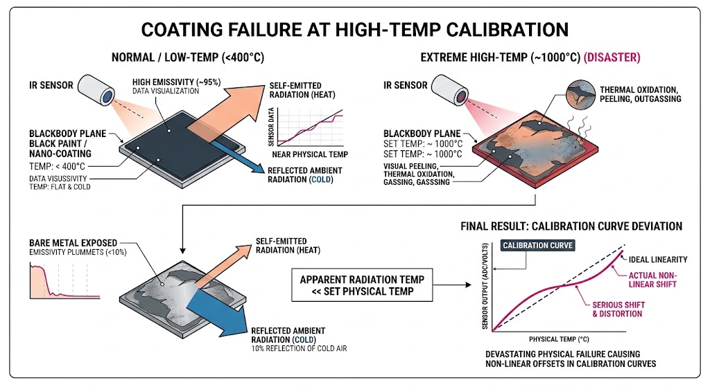 在高溫環境下,任何漆面或奈米塗層都會發生嚴重的熱氧化、剝落或釋氣(Outgassing)現象,一旦塗層的物理結構被破壞,金屬基板的裸露將導致該區域的紅外線發射率從百分之九十五急遽暴跌至百分之十以下,我們可以用純物理的敘述來理解這個災難:物體釋放的總輻射通量包含了自身發射的熱輻射,以及反射自周遭環境的冷輻射,如果黑體設定在攝氏一千度,但其發射率因為塗層失效而降至百分之九十,這百分之十的反射率將會把實驗室周遭的冷空氣溫度「反射」進感測器中,這會導致感測器量測到的「表觀輻射溫度」遠低於設備設定的物理真實溫度,使得所有針對高溫目標特徵建立的校準曲線產生嚴重的非線性偏移。