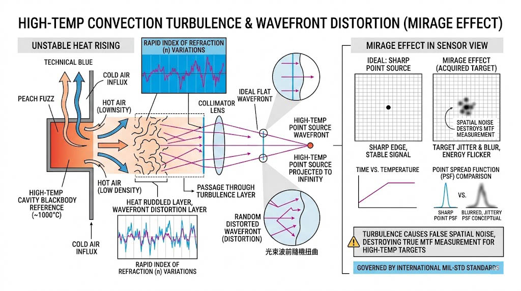 當腔體黑體以極高的溫度向外輻射時,緊貼在黑體開口處的空氣會被瞬間加熱,熱空氣的密度較低,會迅速向上對流上升,而周遭的冷空氣則會不斷湧入補充。這種劇烈的熱對流會在黑體開口前方形成一層極度不穩定的「熱擾動層」,空氣密度的快速變化意味著光學折射率的快速變化,當高溫黑體的紅外線輻射穿過這層熱擾動空氣,或者當工程師使用準直儀將這個高溫點源投射至無窮遠處時,光束的波前(Wavefront)會發生嚴重的隨機扭曲;在感測器的畫面上,這會表現為目標邊緣的持續抖動、模糊與能量閃爍,這在光學上被稱為「海市蜃樓效應(Mirage Effect)」,如果測試設備缺乏針對開口處的熱氣流導引設計,或是缺乏強化的光圈隔熱擋板,這種由空氣擾動引起的虛假空間雜訊,將使工程師完全無法驗證感測器在觀測高溫目標時的真實空間解析度(MTF)。