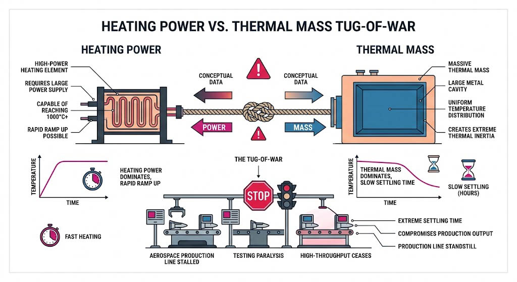 這引發了熱動力學上的第三大衝突:「加熱功率與熱質量的拔河」,為了讓一個金屬腔體均勻地達到一千度,必須使用極大功率的加熱元件,同時腔體本身必須具備足夠的熱質量以維持溫度的絕對均勻,然而龐大的熱質量將帶來極端的熱慣性,當系統試圖從一千度降溫時,如果僅依靠自然輻射與對流散熱,可能需要耗費數小時才能達到新的熱平衡點。