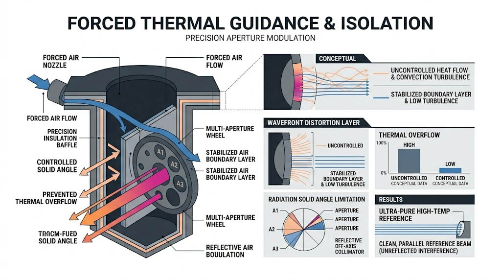 為了解決熱擾動與波前畸變,高溫黑體的光學開口必須配置「主動或被動式熱隔離防護」,系統前端必須整合精密加工的隔熱擋板與多孔位光圈輪,這不僅能精確限制高溫輻射的輸出立體角(Solid Angle),避免多餘的熱能外溢烘烤光學平台上的其他精密透鏡;更能在幾何上穩定開口處的空氣邊界層,大幅降低對流擾動的劇烈程度,當結合反射式離軸準直儀時,這種純淨的高溫點源能被完美轉換為無像差的平行光束,精確模擬數十公里外的極音速發動機熱特徵。