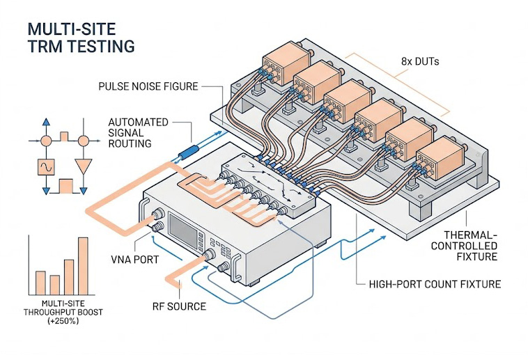 一個及格的 TRM 驗收測試,量測項目極端廣泛,跨越了不同的儀器領域,測試發射路徑(Tx Path)的輸出功率、增益壓縮點與脈衝包絡(Pulse Profiling)通常依賴高階向量網路分析儀(VNA)或峰值功率計;然而,測試接收路徑(Rx Path)的雜訊指數(Noise Figure),特別是在脈衝狀態下的高階量測(Pulse Noise Figure),往往需要極低底噪的頻譜分析儀(Spectrum Analyzer)才能達成。
