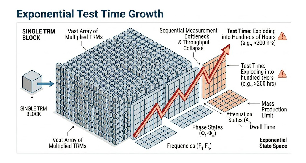 在傳統的測試儀器架構中,每一次狀態的改變(例如切換到下一個相位)都需要透過電腦發送指令,儀器內部合成器需要時間鎖定(Settling Time),接收端也需要駐留時間(Dwell Time)來獲取足夠的訊號雜訊比,這種循序漸進的非同步量測方式,會讓單一 TRM 的完整測試時間長達數小時,當面對一部 AESA 雷達所需的上萬顆 TRM 時,這種呈指數級膨脹的測試工時,會徹底癱瘓量產量(Throughput),讓雷達系統的交付期變得遙遙無期。