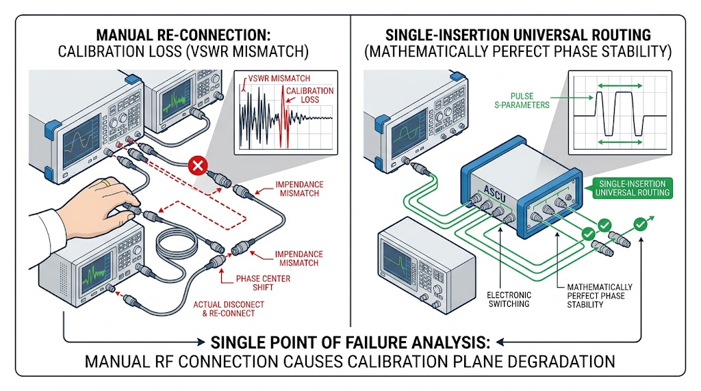 在微波頻段(如 X-Band 或 Ku-Band),這種「人工作業」是計量學上的災難,每一次同軸接頭的旋鬆與鎖固,都會產生無法預測的微米級幾何變化,導致嚴重的相位中心偏移(Phase Center Shift)與阻抗不匹配(Impedance Mismatch),更致命的是,手動插拔會瞬間摧毀測試開始前花費數小時建立的系統誤差修正模型(System Error Correction),在沒有完美校準平面(Calibration Plane)的情況下,所測得的 TRM 通道間相位差(Phase Imbalance)將充滿人為誤差,一旦這些帶有偽性偏差的模組被組裝上雷達陣列,AESA 最核心的空間波束賦形能力將徹底瓦解。