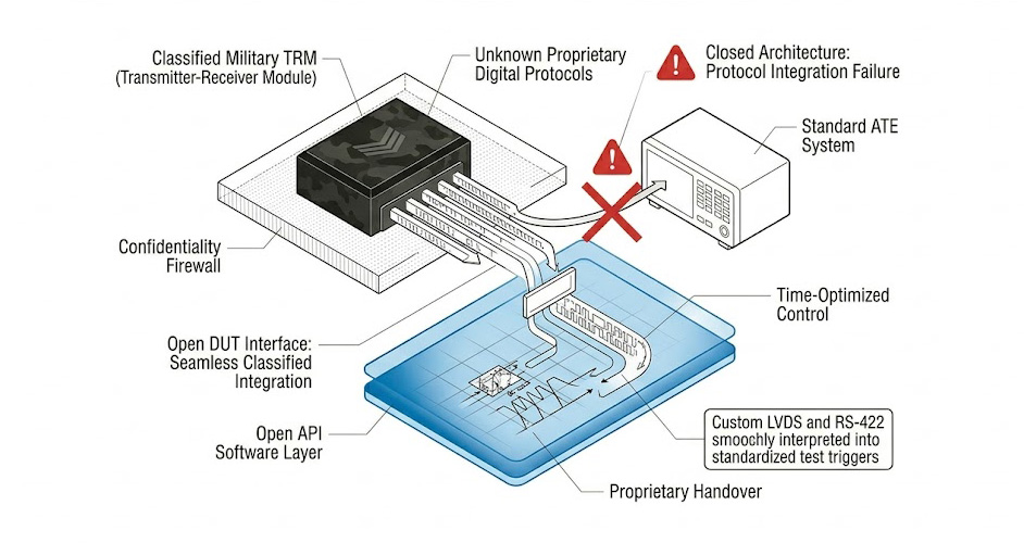 自動化測試設備必須精確地模擬雷達的後端控制單元(Beam Steering Controller),在發送射頻微波脈衝的「前幾奈秒」,透過這些專有介面將 TRM 設定至正確的收發狀態與相位權重,實務上的痛點在於,傳統的 ATE 系統架構通常是封閉的,當系統整合商試圖將雷達廠高度機密的控制時序寫入 ATE 的硬體觸發單元時,往往被要求進行耗時的 FPGA 重新編程,或被迫將機密的通訊協定細節洩露給儀器供應商。