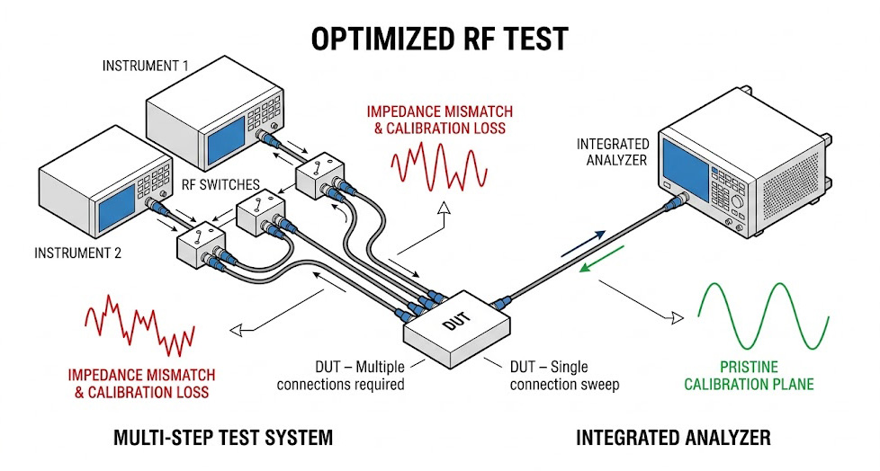 在傳統的實驗室環境中,這些不同的量測項目必須依賴不同的高階儀器:向量網路分析儀(VNA)負責 S 參數;頻譜分析儀負責雜訊與諧波失真;峰值功率計負責脈衝包絡。實務上的災難在於「射頻佈線的切換」,當測試流程從發射路徑(Tx)的 S 參數測試,切換到接收路徑(Rx)的雜訊指數測試時,測試系統必須透過龐大且複雜的機械式射頻繼電器矩陣(RF Switch Matrix)來改變訊號路徑。