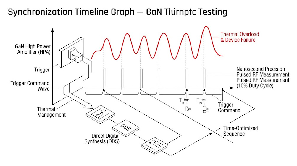 採用氮化鎵(GaN)技術的高功率放大器(HPA)是現代 TRM 的動力核心,為了在極小的體積內榨出極限功率,這些元件的散熱設計完全是針對「低工作週期(Low Duty Cycle)」的脈衝運作模式所打造的,若在測試時誤將連續波(CW)訊號注入這些高功率模組,GaN 元件的結溫(Junction Temperature)將在幾毫秒內飆升至臨界點,瞬間引發熱崩潰(Thermal Runaway)並將昂貴的模組徹底燒毀。