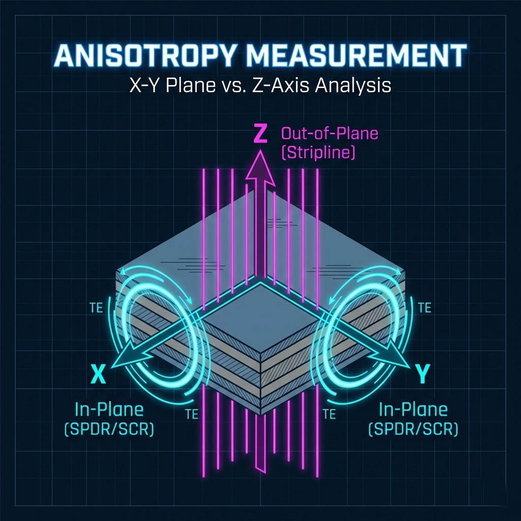 經驗豐富的工程師會將同一塊材料分別送入 SPDR (測 X-Y) 與帶狀線治具 (測 Z),比較兩者的 Dk 差異,進而計算出材料的「異向性比率 (Anisotropy Ratio)」,這對於高頻濾波器設計至關重要。