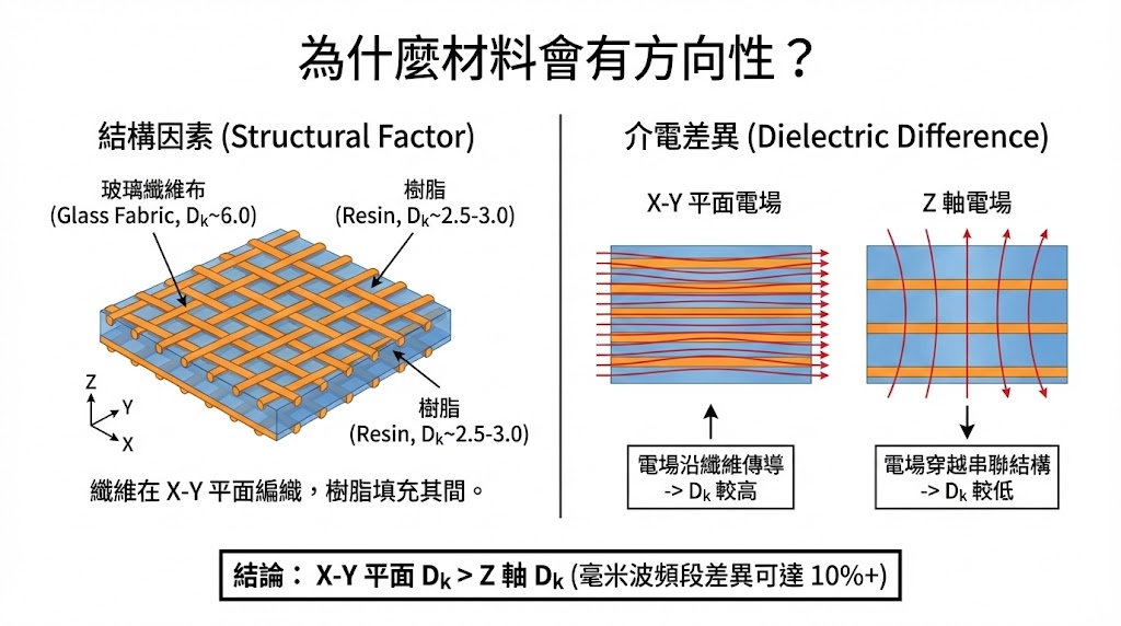當電場平行於板材表面 (X-Y 平面) 時,電場主要沿著纖維傳導;而當電場垂直於板材 (Z 軸) 時,電場則必須穿越樹脂層與纖維層的串聯結構,這種微觀結構的差異,導致了巨觀電氣特性的不同;通常,X-Y 平面的 Dk 值會高於 Z 軸,這種差異在毫米波頻段可能高達 10% 以上,忽略此差異將直接導致天線設計的頻率偏移。