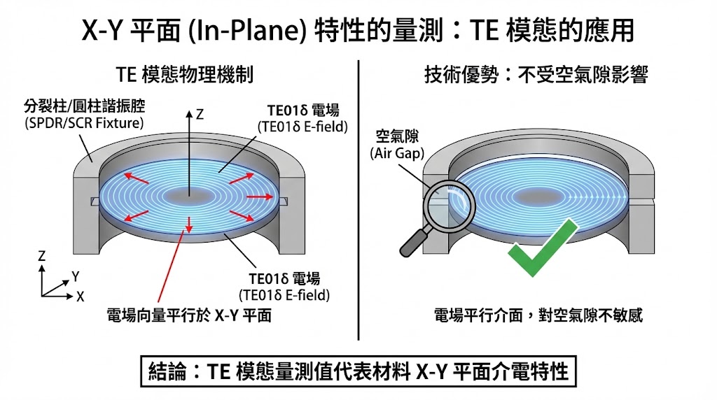 要量測材料在 X-Y 平面的特性,我們通常使用分裂柱介電諧振 (SPDR)分裂圓柱諧振 (SCR) 技術,這類技術的共同物理特徵在於使用了 TE (Transverse Electric) 模態,特別是 TE01δ 模態,在這個模態下,電場向量呈現「同心圓」狀分布於樣品平面上,意即電場方向完全平行於樣品表面 (X-Y 平面),因此這類方法測得的 Dk 與 Df 值,嚴格來說是代表材料在 X-Y 平面 的介電特性。