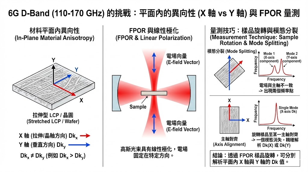 針對 6G 材料或特殊晶體,利用 FPOR 的極化特性,檢測 平面內 (X vs Y) 的異向性。