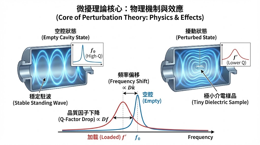 微擾法的核心思想在於「干擾」而非「改變」整個系統,想像一個高品質因子 (High-Q) 的空金屬共振腔,當電磁波在其中共振時,會形成穩定的駐波模式,當我們將一個體積遠小於腔體體積(通常小於 1/1000 或更小)的介電材料樣品,放入腔體中電場最強的位置時,樣品的引入會對原本的電磁場造成輕微的擾動,根據微擾理論,這種擾動會直接反映在兩個可測量的物理量變化上: