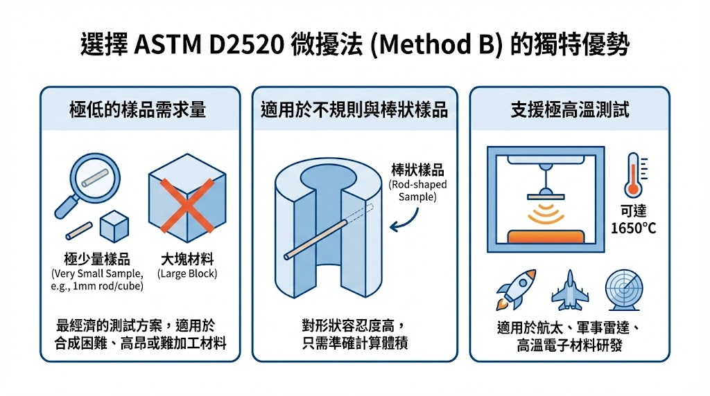 對於實驗室階段的材料研發,ASTM D2520 方法 B 具備以下獨特優勢: